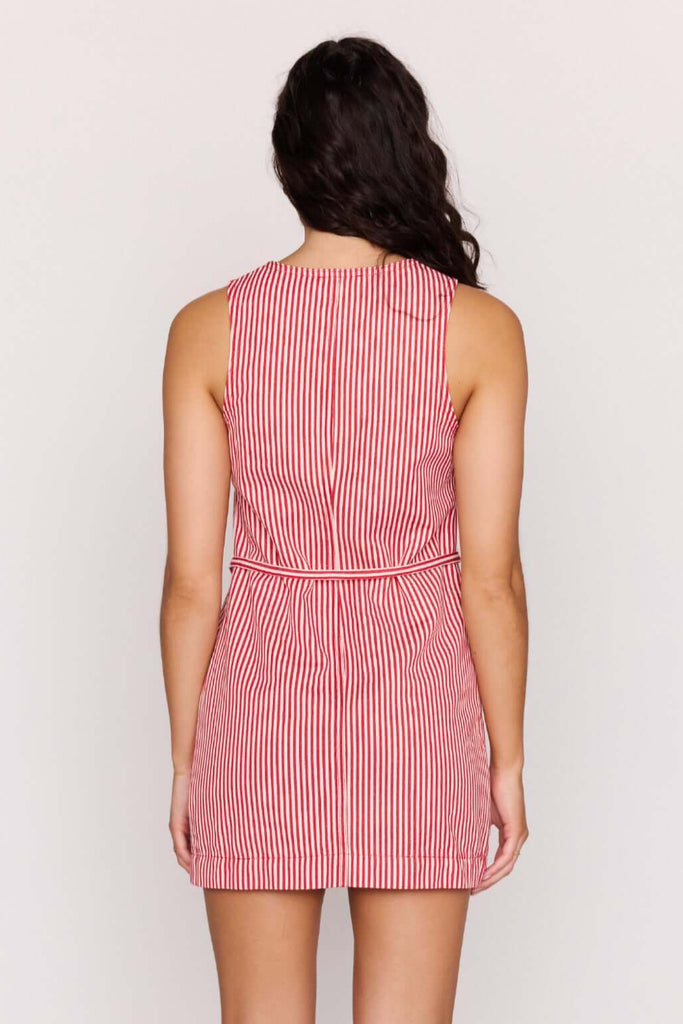 The Freya Red Pinstriped Denim Mini Shift Dress is a fresh everyday mini designed with classic red and white vertical stripes and a relaxed shift silhouette. Featuring a sleeveless cut, button-through front and adjustable waist tie, this dress is perfect for warm-weather days, weekend plans and easy off-duty styling.
