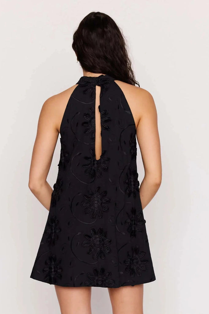 The Roma Black Cotton Applique High Neck Mini Dress a statement piece designed with intricate floral applique and a sleek halter-style neckline. Crafted in cotton with a softly structured silhouette, this mini dress is perfect for evening events, special occasions and elevated nights out.