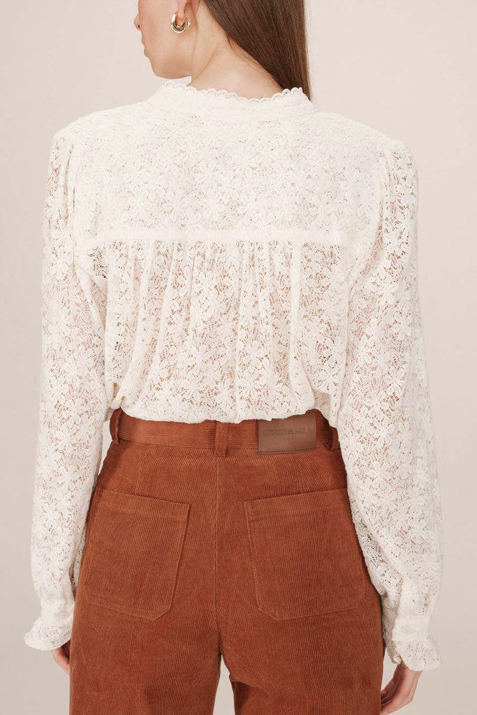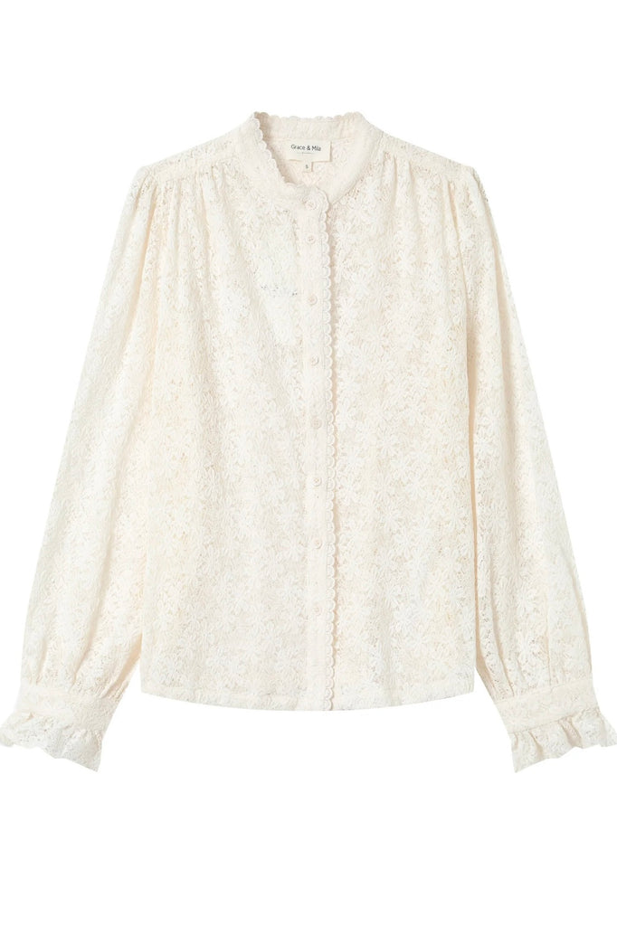 The SWING lace blouse, with its vintage and romantic vibe, is a boldly feminine piece. It features ruffled cuffs and lace trim at the neckline, offering a classic and elegant silhouette. The straight cut and buttoned long sleeves of the SWING round neck blouse make it a chic and timeless style.